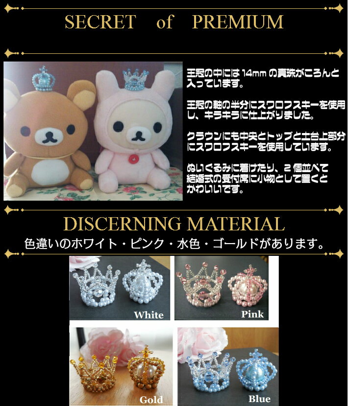 クラウン ・SW(#5000/ダイヤカット)6mm1個 ・SW(#5328/そろばん)3mm8個 ・SW(#5328/そろばん)4mm8個 ・丸小ビーズ ・真珠 3mm ・ワイヤー (#24)(#28) 色 ・ホワイト・ゴールド・ピンク・水色商品説明 指でつまめるサイズのミニチュア王冠とクラウンのセットです。
