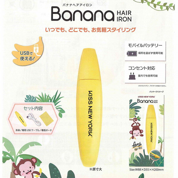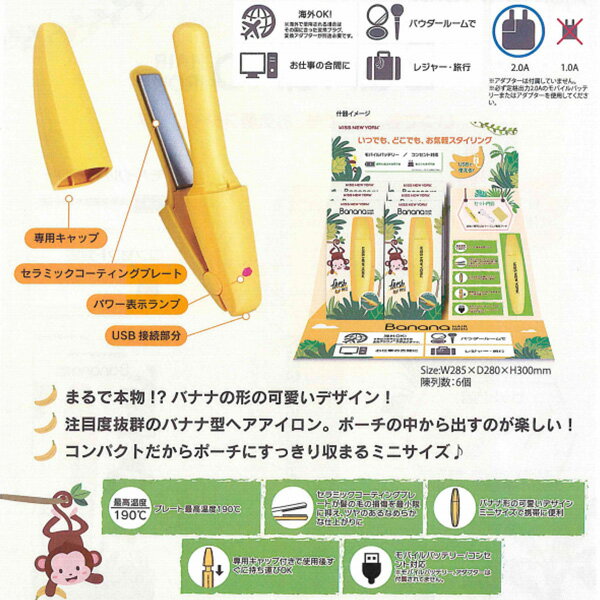 店舗トップへ 商品名 バナナヘアアイロン サイズ / 重量 約W146×D35×H31mm / 83g 付属品 USBケーブル、ポーチ 商品説明 ●まるで本物!?バナナの形の可愛いデザイン! ●注目度抜群のバナナ型ヘアアイロン ●ポーチの中から出すのが楽しい! ●コンパクトだからポーチにすっきり収まるミニサイズ ・USBで使える! ・モバイルバッテリー・コンセント対応 ※2A対応。