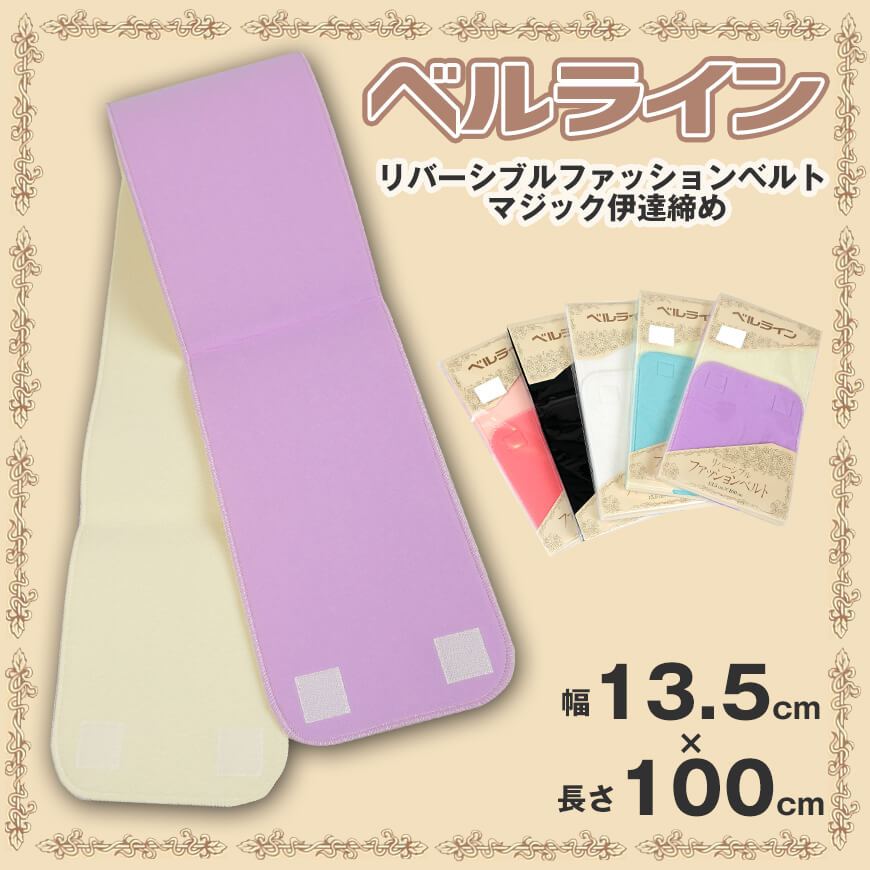 ベルライン リバーシブルファッションベルト マジック伊達締めの詳細商品名ベルライン リバーシブルファッションベルト マジック伊達締め対象者レディーズサイズ幅13.5cm×長さ100cmカラー白/黒/ピンク/紫/サックス素材・加工ナイロン100%素材製造元:アキレス株式会社製品製造元:上田織物株式会社生産国日本製(MADE IN JAPAN)関連キーワードだてしめ/伊達志め/伊達〆/マジックベルト/和装小物/礼装/舞踊/踊り/着物/着付け/袴/浴衣/waso224ベルライン リバーシブルファッションベルト マジック伊達締め 幅13.5cm×長さ100cm 長襦袢や着物を留めるマジック式のベルトです。